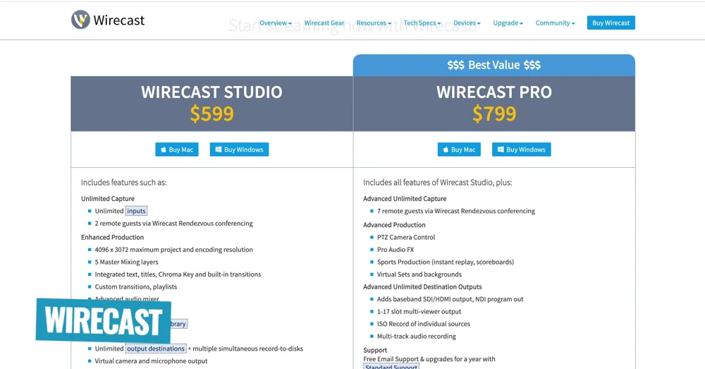 Like vMix, Wirecast is a one time fee. There are two pricing options available: