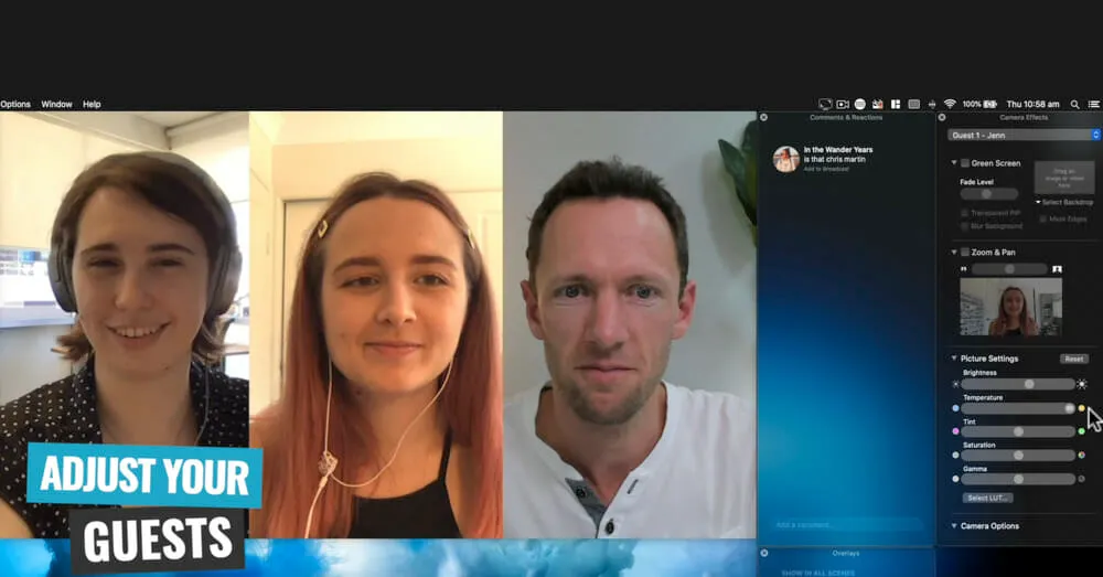 It’s probably not as seamless as StreamYard’s feature but you can access to next level controls. Not only can you tweak and adjust what your cameras look like but you can also tweak and adjust what your guest’s cameras look like as well.