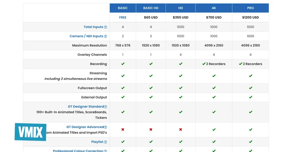 There’s a one time fee for lifetime access to vMix. You can choose from a lot of different pricing options depending on which features you want access to: