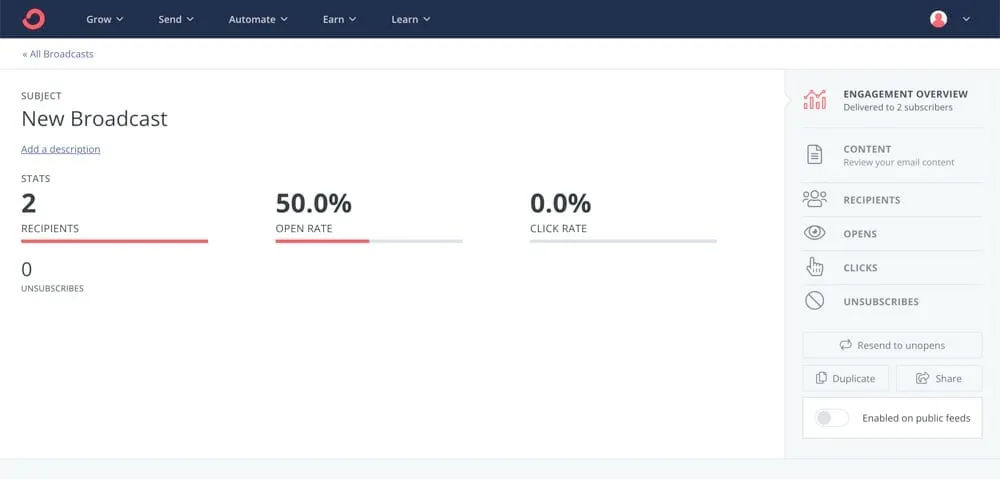 | Send a broadcast⭐⭐⭐⭐ | Sending a text-only broadcast isn’t as quick and easy as a tool like ConvertKit but the email builder and emailing process is smooth and intuitive. |