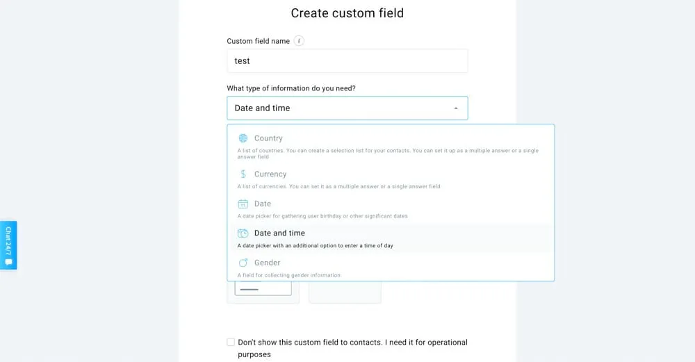 The custom fields are quite basic. There’s not a separate area to manage them - this can only be done inside a contact’s profile.