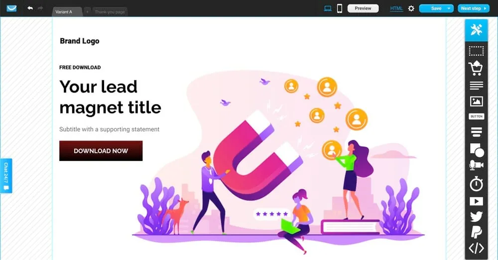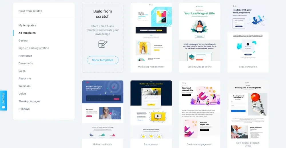 GetResponse has a built-in website builder. It has pre-built templates, blank templates and soon you’ll be able to import your own website as well.