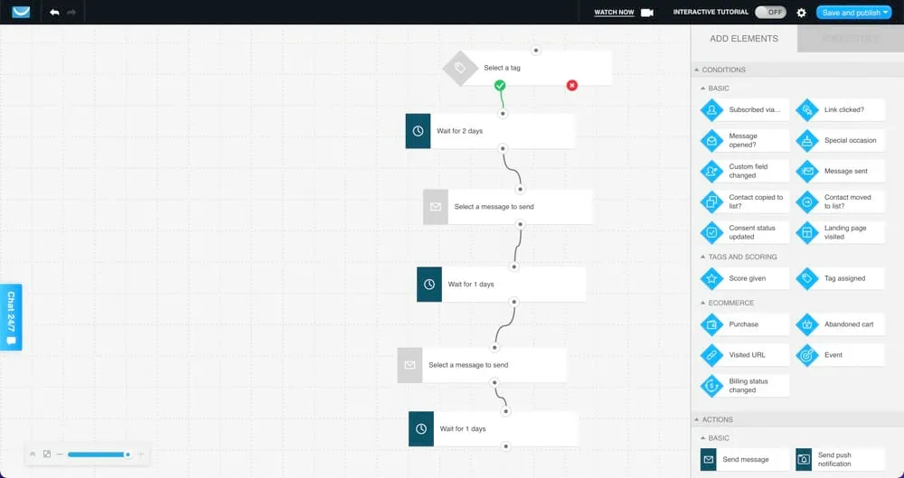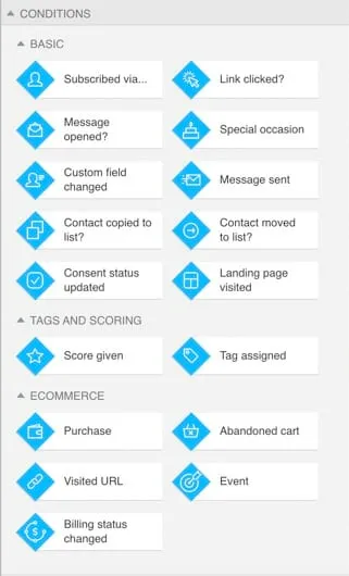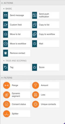 There are 17 basic triggers such as subscribes, clicks a link, tag assigned and visits a landing page. You’ll also have access to 11 basic actions including send message, wait, move to workflow, tag and score.