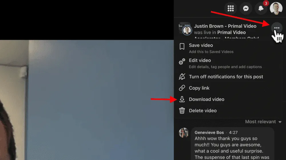 Open Facebook and navigate to the video you want to download. Click the Three Dots icon in the top right corner. A dropdown menu will appear and you’ll see the option to Download video.