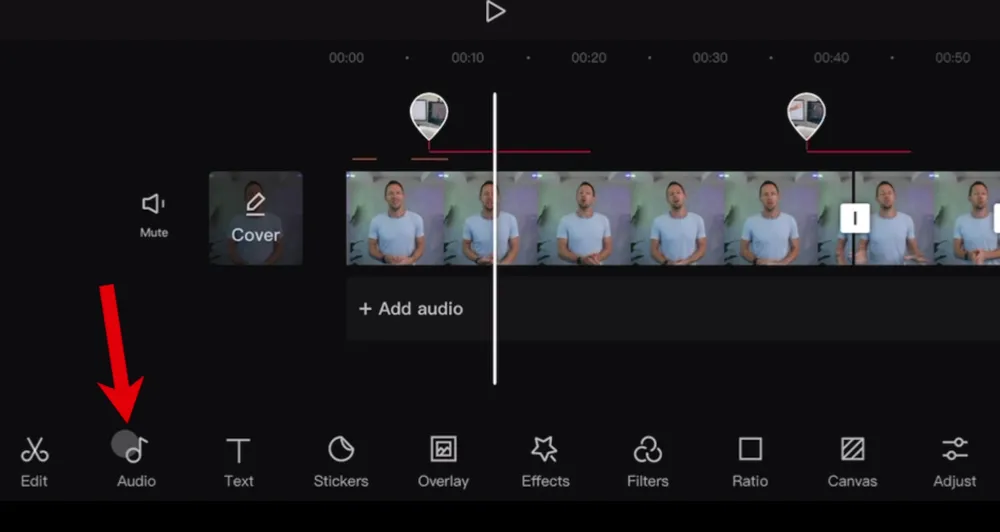 To do this, you can press the Add Audio button below the primary footage on the timeline or you can hit Audio in the bottom menu.
