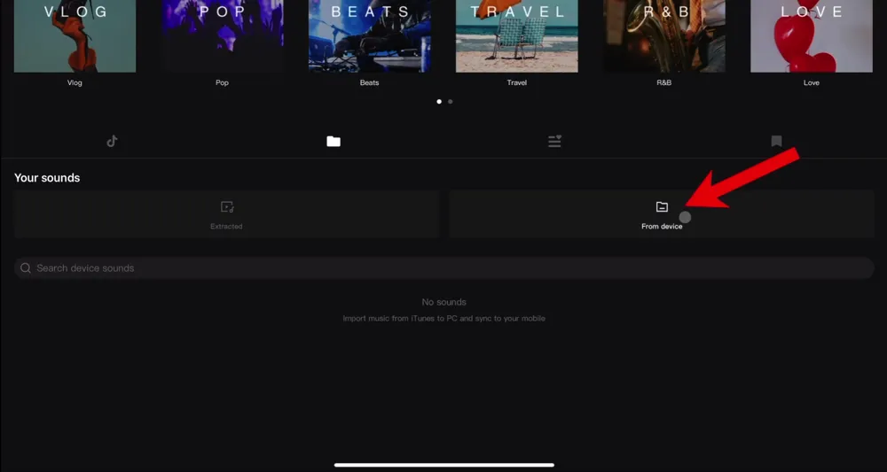 If the music you want to use is on your device, you go to the Folder icon and select From Device. You should see your audio tracks appear, you can select it and it will be added to your timeline.