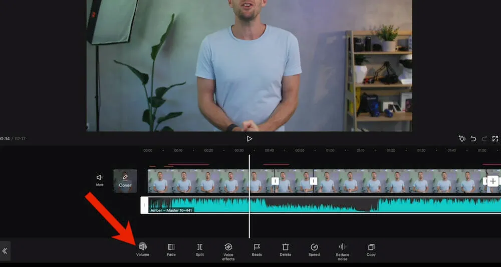 So we’ll start by muting the music track so we can focus on the primary audio. Tap the audio clip, press the Volume button and drag the slider to zero.