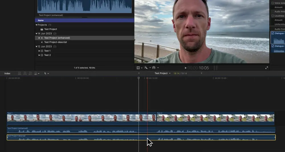 We’ve imported the audio files from Adobe Podcast and Descript into the same video editing timeline so we can compare the results.