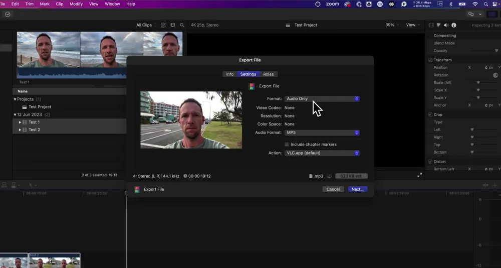 In Final Cut Pro (as an example), you need to go to File → Share → Export File. Go to Settings, select Audio Only and adjust the Audio Format to MP3. Hit Next, name the project and press Save.