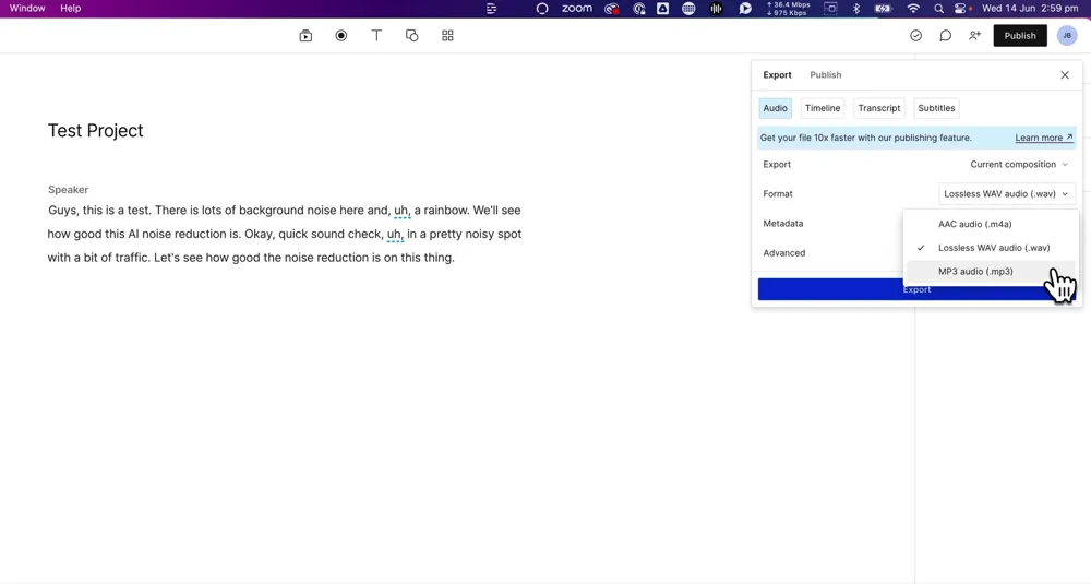 To save this out, go to Publish and then choose Export. Select your audio format - AAC, WAC or MP3 file. We’ll be choosing MP3 and then you can press Export.
