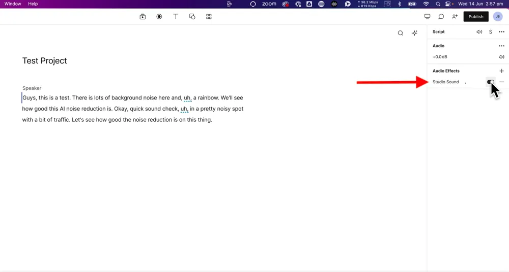 Once the file is imported, you can remove the background noise by toggling on Studio Sound in the right menu.