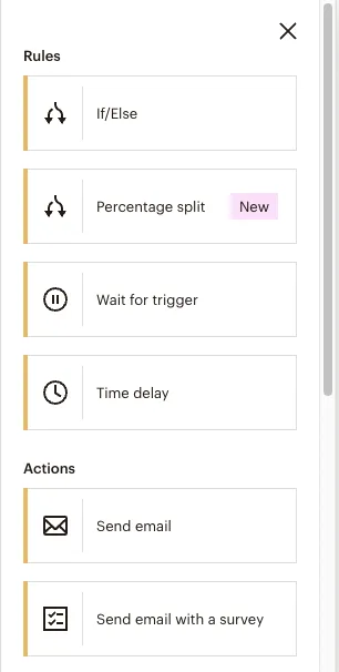 From there you can add a Journey Point. There aren’t as many options here - only four rules (if/else, wait for trigger, time delay and percentage split) and seven actions (send email, group, tag, update contact, etc).