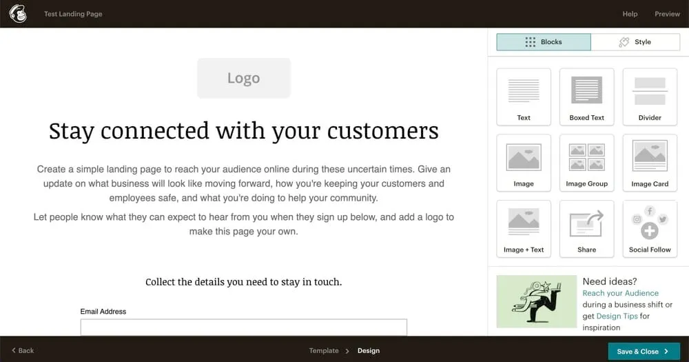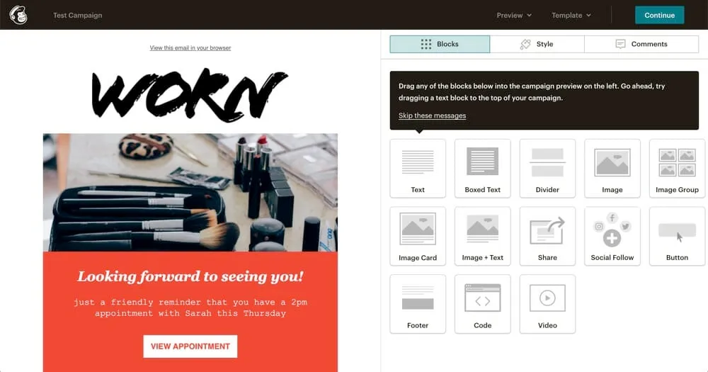 You can edit text directly inside the text boxes which makes it a much more seamless process than in Mailchimp where there’s currently a separate box for writing text.