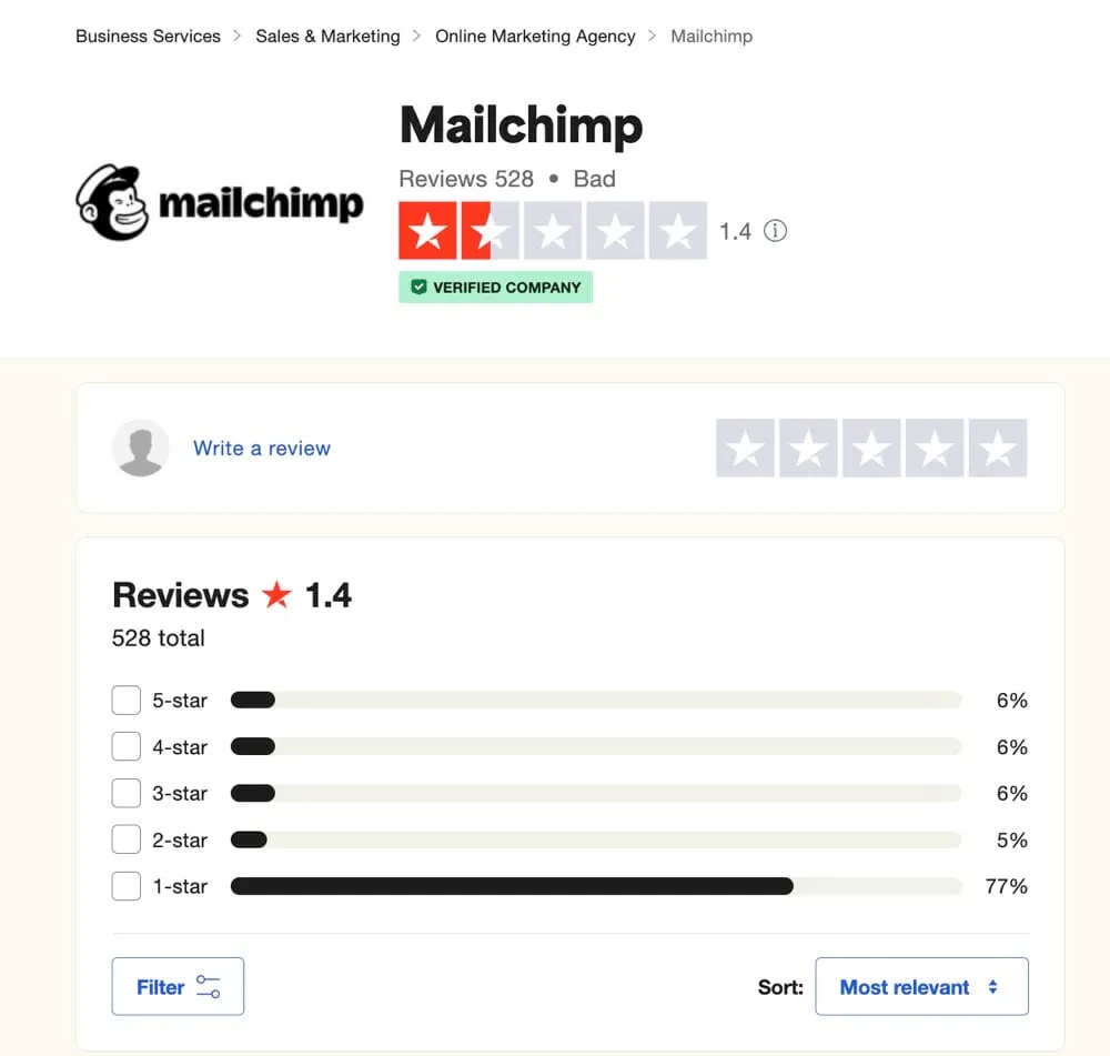 Mailchimp has a TrustPilot rating of 1.4/5 star rating. They received one star reviews from 77% of reviewers. Most of the bad reviews claim bad customer service, falling delivery rates or accounts being suspended for violating policy for unknown reasons and no explanations.