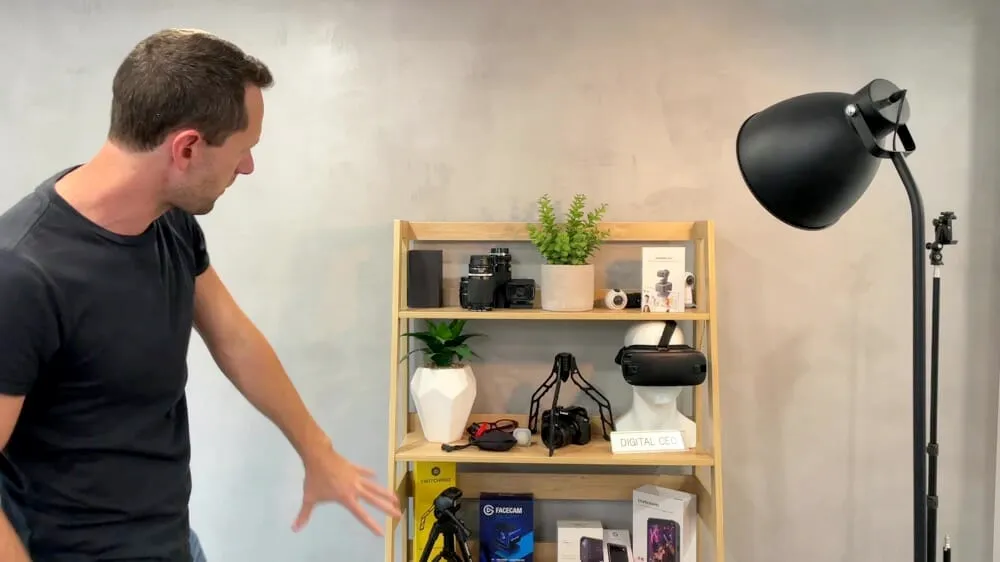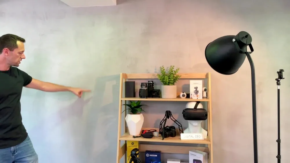 This light is super powerful so it only needs to be on a low power to make a big difference. The dome throws a soft light that nicely lights Justin up when he’s filming YouTube videos.