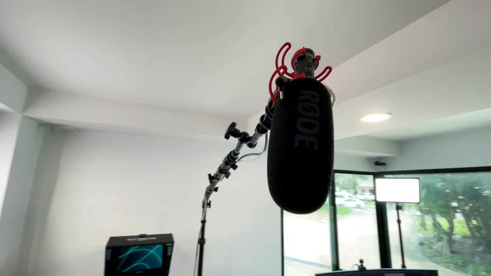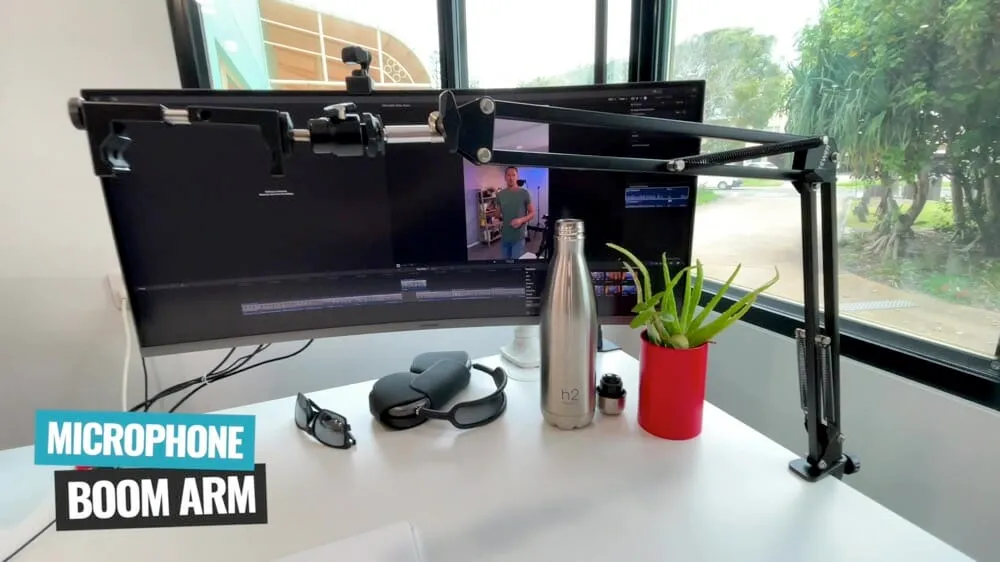 The mic is also connected to a Mac Mini M1 so Justin can use it for his audio in webinars, live streams or video calls. It can easily be spun around so he can use it in front of the camera and at his desk.
