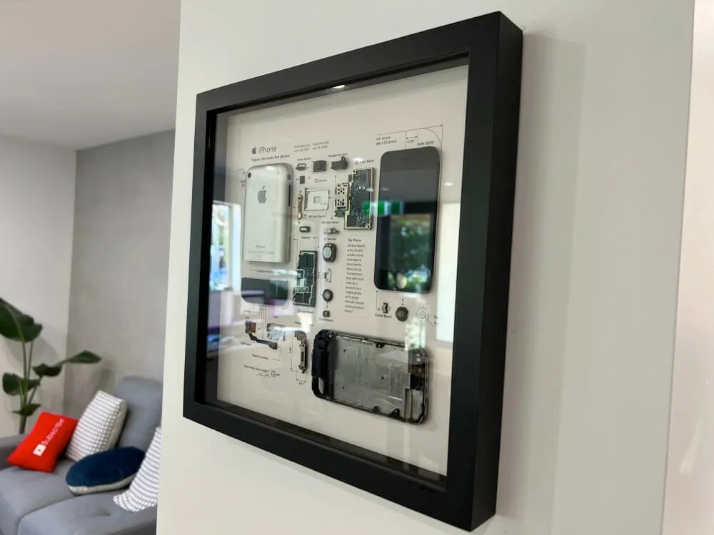 The first piece of artwork we hung was a disassembled iPhone 2G created by Xreart. All the pieces are neatly laid out inside the frame.