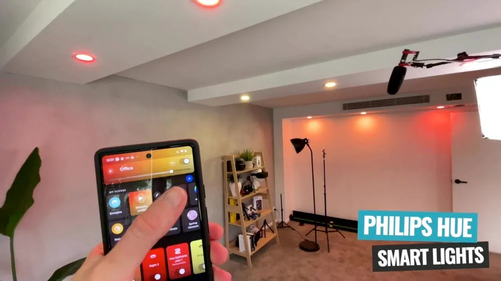 There are nine ceiling lights throughout the YouTube studio. All of these are Philips Hue Smart Lights.