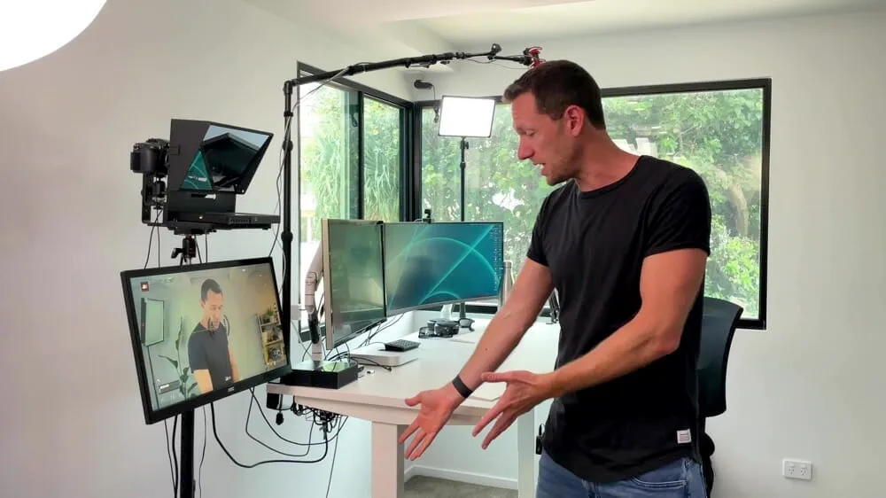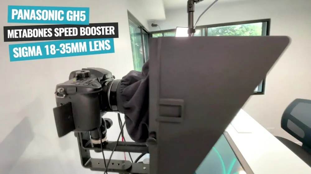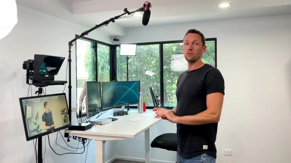 In front of the camera is a teleprompter for if Justin needs to read word for word off a script. This one is the Yogogo Teleprompter - it’s a cheap one, great bang for buck and works really well.