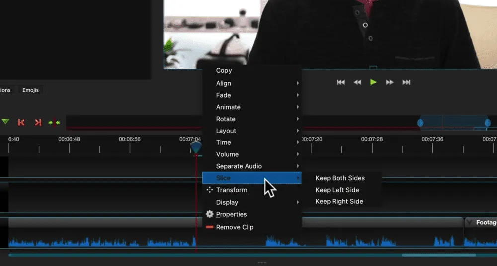 - Right click on the clip, go to Slice and select Keep Left Side