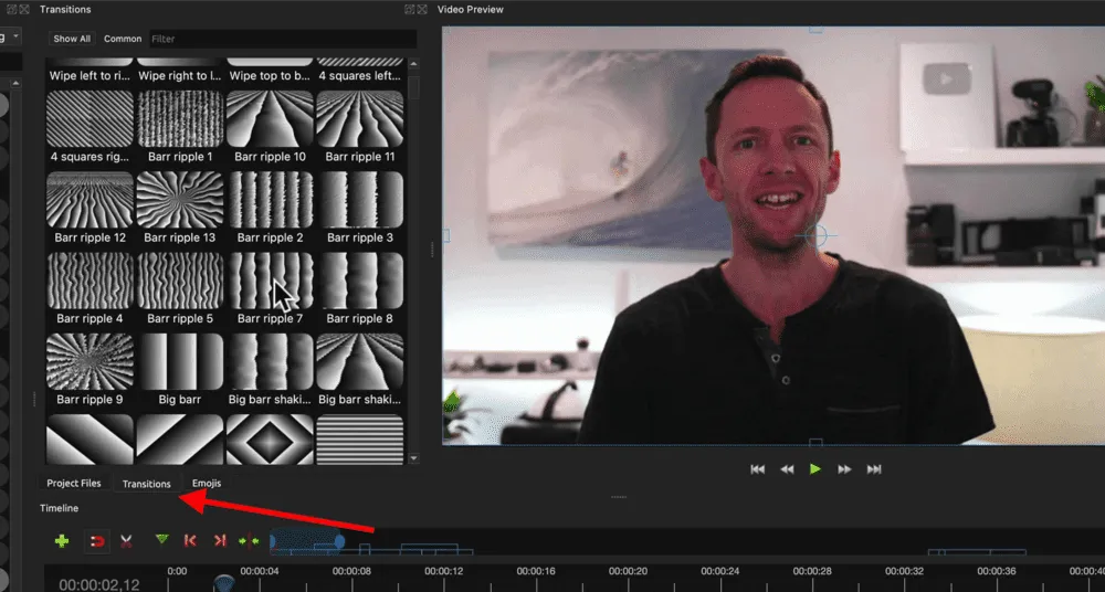 To add a transition, go to Transitions in the Project Files window. There are a ton of different options you can choose from.
