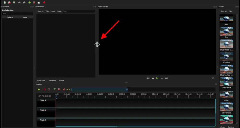 - Project Files Area: Where all your files will be (you can change this to show transitions, effects and emojis)