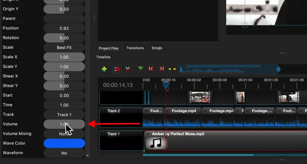 Let’s begin by muting the music track so we can focus solely on the primary audio. To do this, select the music clip and go to the Properties window. Go down to Volume and turn this down to zero.