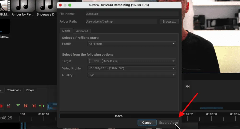 To export your project, press the Export button in the top menu (it’s a red circle icon). Give your file a name, choose where you want it to be saved and then you can select the export settings.