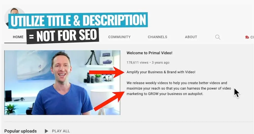 Make sure you use the title field and the description box of your YouTube channel trailer. You don’t need to worry about optimizing for SEO or mastering the perfect title here. Just tell your viewers about your channel and encourage them to subscribe.