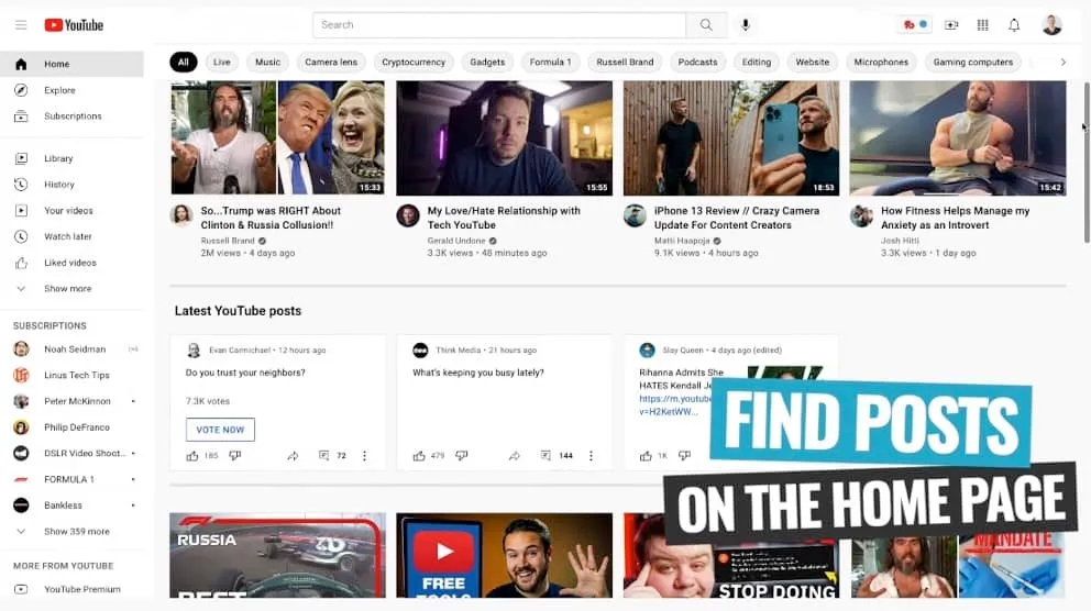 When using the web browser, you’ll find Community posts on your homepage. Just scroll down a little bit and there’s a section called Latest YouTube Posts.