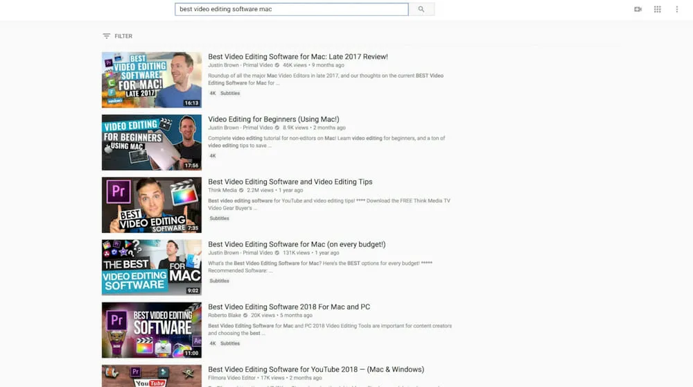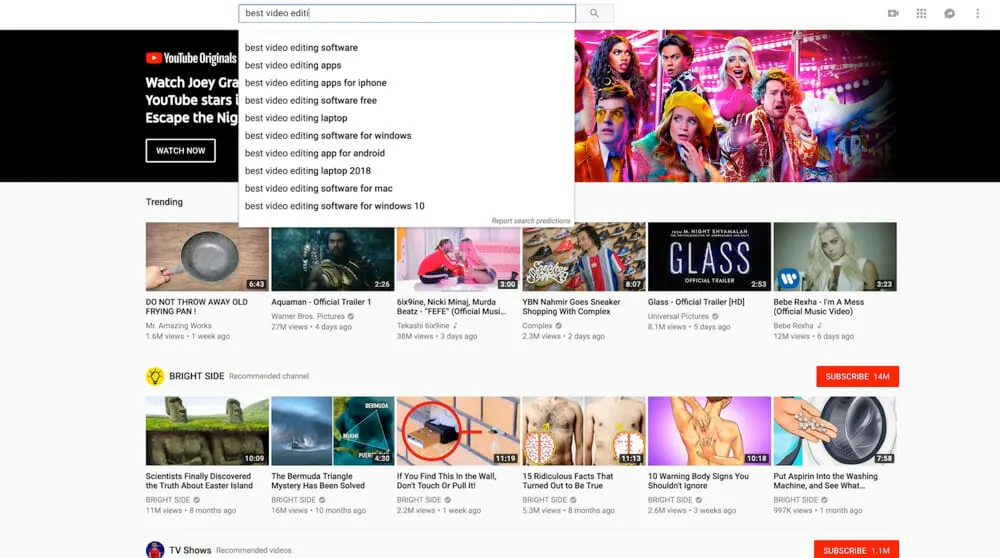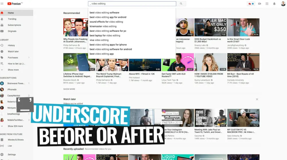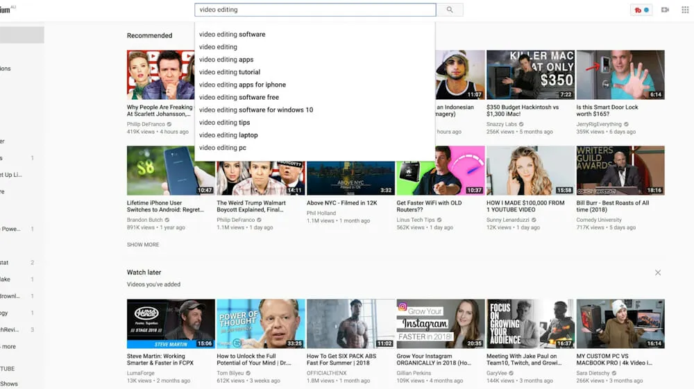 Then start typing a topic into the YouTube search bar. For this example, we’ll use ‘video editing’.
