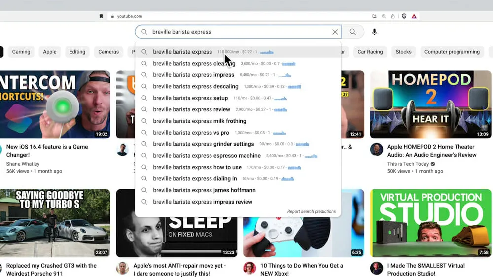 Let’s jump over to YouTube with our keyword research tool, Keywords Everywhere, enabled. Doug wanted to create a video about his coffee machine which is the Breville Express.