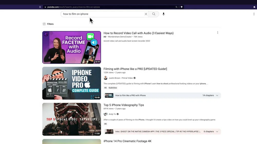 Let’s try another one. When searching for ‘how to film on iPhone’ our video that’s two years old shows up in the TOP spot.