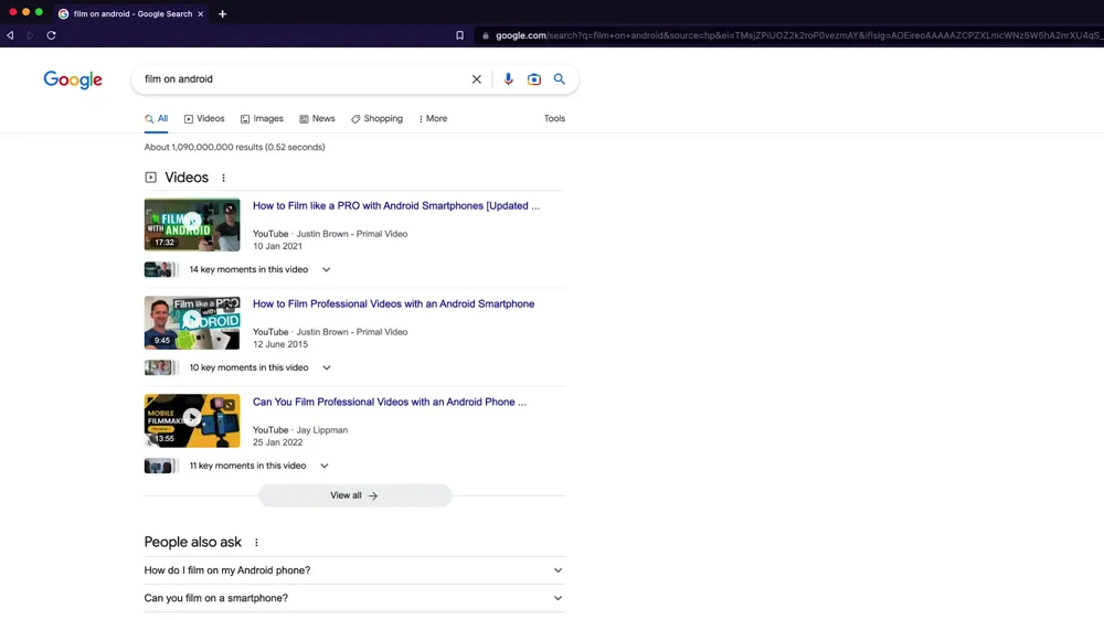 If we jump over to Google and search for ‘film on Android’, our videos show up in the top two spots! That’s before any ads or other content. Then if we scroll down a bit you’ll see the blog post on our website is showing up right at the top as well.