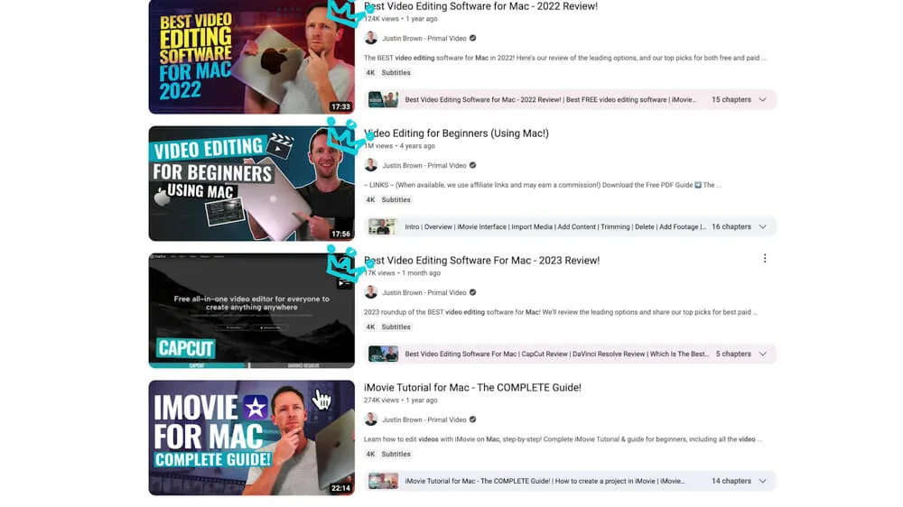 Let’s jump over to YouTube in an incognito window. If we search for ‘video editing on mac’, you’ll see a couple of ads and then our YouTube videos rank 1st, 2nd, 3rd, 4th and 7th in the YouTube search results!