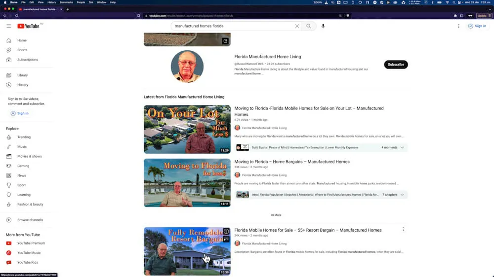 Then there’s our friend Russell who’s niche is manufactured homes in Florida. If you search for ‘manufactured homes Florida’, Russell absolutely dominates for that search term in YouTube search results. His channel appears and then strategic YouTube video after strategic YouTube video that he’s released.