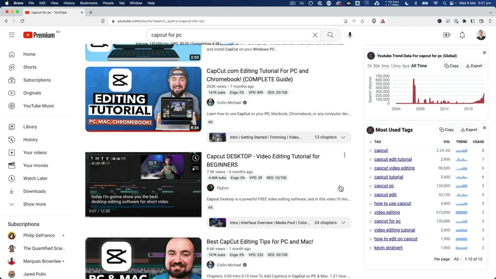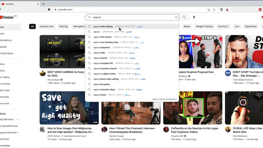 So if we go over to YouTube with Keywords Everywhere enabled, and search CapCut this is what pops up: