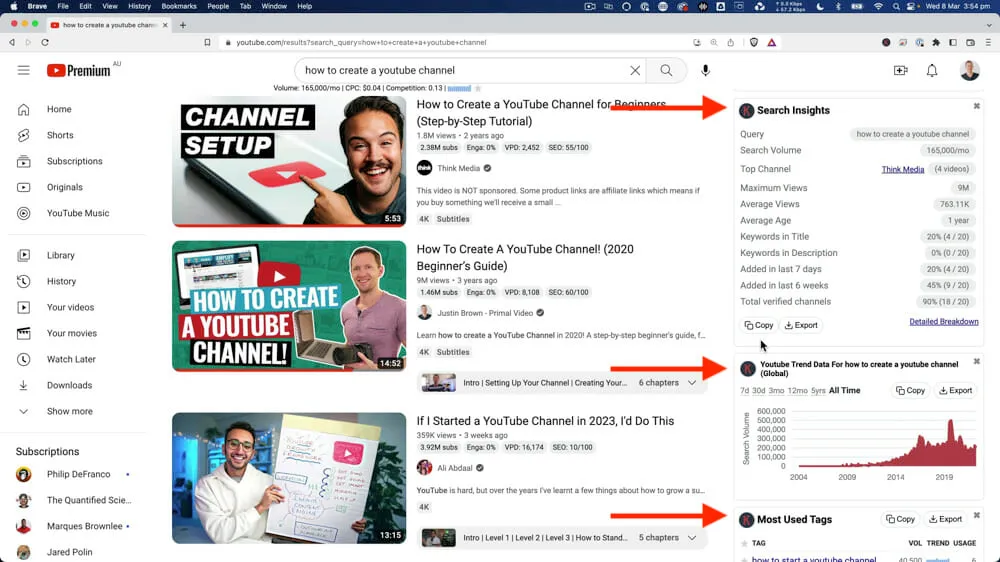 If you go ahead and run a search in YouTube while Keywords Everywhere is enabled, you’ll also see extra data on each of the YouTube videos that appear in a search.