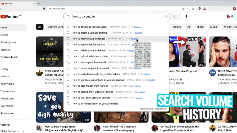 Then when you do the same search in the YouTube search bar, you’ll see the same suggestions will appear but there’ll also be the search volumes displayed next to each suggestion.