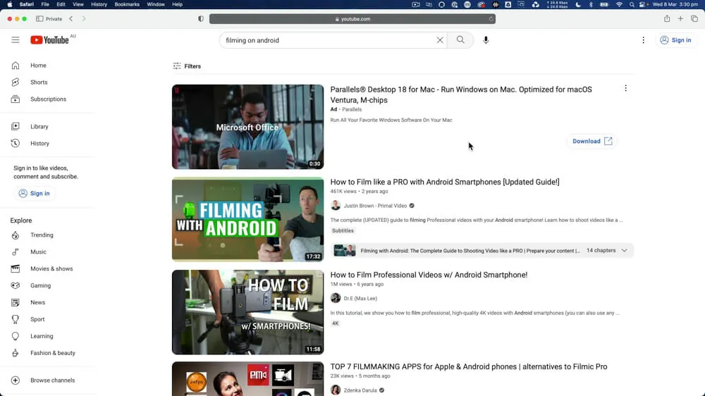 Let’s try searching for another popular search term in our niche - ‘filming on Android’. You’ll see one of our YouTube videos pop up as number one. And if you scroll down a little bit, there’s a video that we published on our YouTube channel FIVE years ago which is still performing and showing up here.