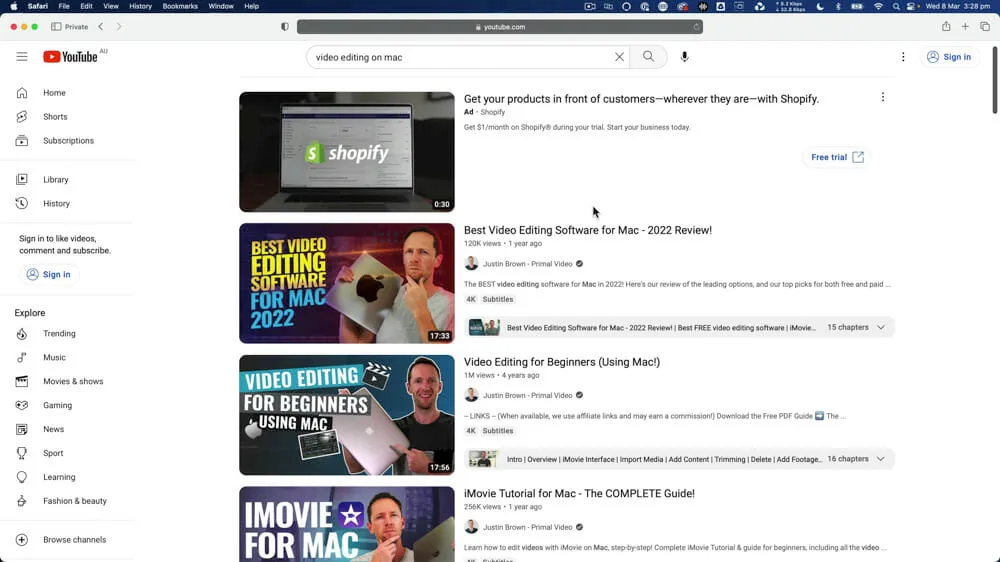 When searching for ‘video editing on mac’ our YouTube videos take out the first, second, third AND fifth spots.