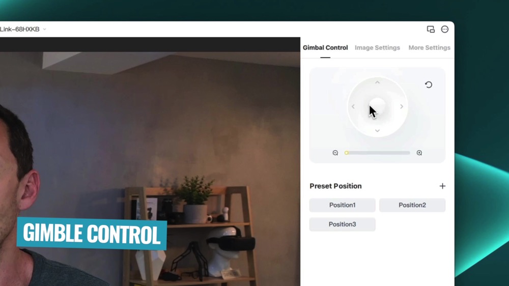 The first setting in the software is gimbal control. Here you can pick up the knob to move around the camera and reframe your shot. Because it’s a full three axis gimbal, you can move it up, down, left and right.